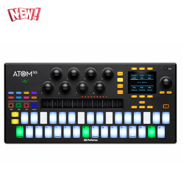 The Presonus ATOM SQ was designed as a versatile and expressive MIDI pad controller for contemporary music production. Its unique design is optimized for both classic TR-style 16-step beat sequencing and drum pattern editing in Studio One or playing instruments and launching clips in Ableton Live—yet its staggered and RGB-lit 32-pad configuration is instantly familiar to anyone who’s played a controller keyboard. Advanced features let you change the keyboard scale, and a built-in arpeggiator and user-configurable touch strip make the ATOM SQ the most expressive controller you’ll ever use.
